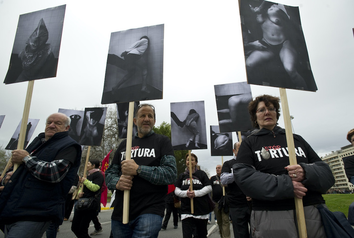 Recreaciones de diferentes modos de torturas, todos recogidos en este informe con casos reales, en una manifestación en Iruñea. (Jagoba Manterola | Foku)