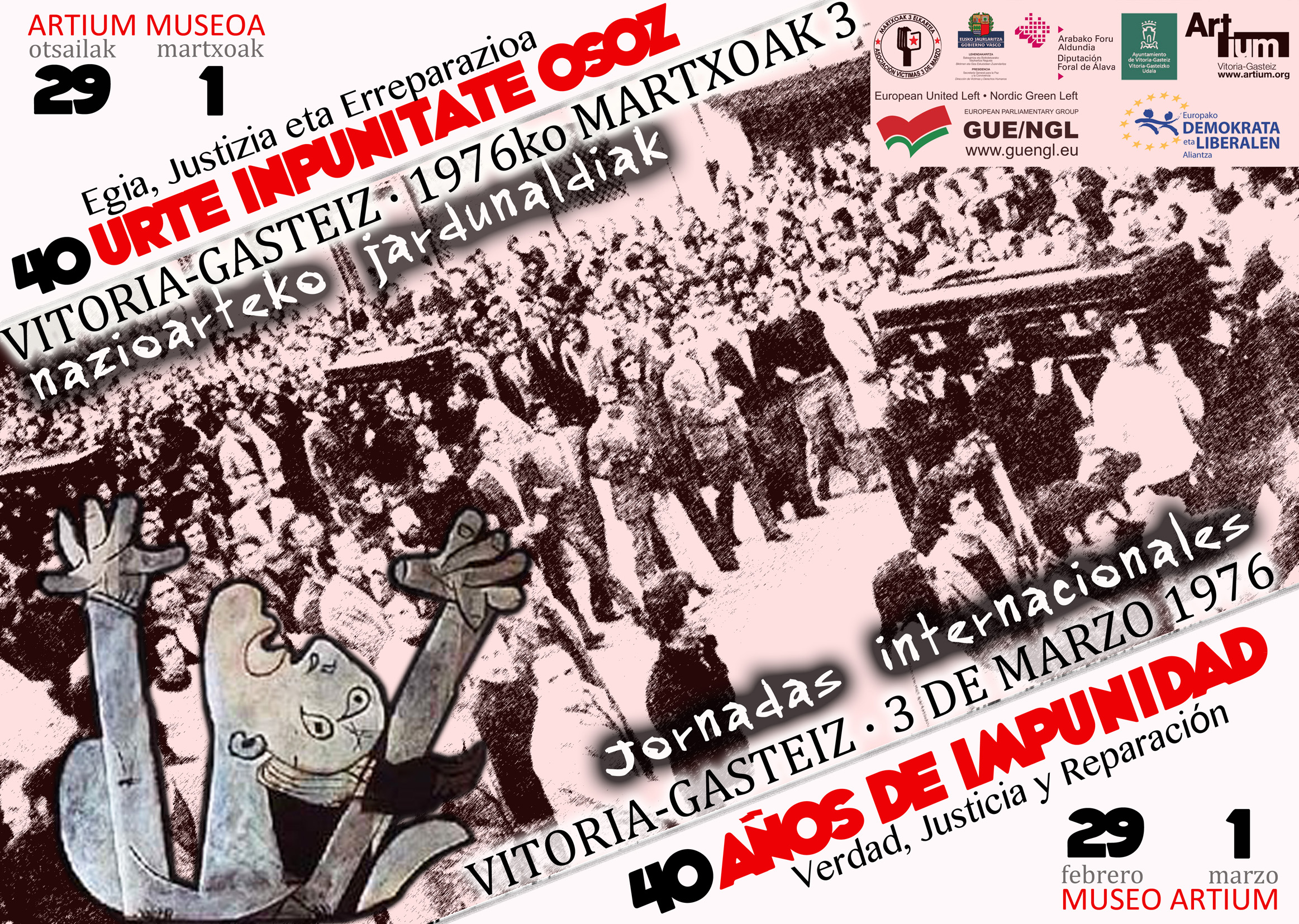 Hori plazaratzeko antolatzailea izan den Talde Ereagilearen partaide izan gara, Martxoak-3 Elkartearekin eta EAJ/PNVko baita EH Bilduko eurodiputatuen partaidetzarekin. Jardunaldi Internazionalak antolatu ditugu otsailaren 29 eta martxoaren 1erako, hainbat saio ezberdinak eratuaz gaur arte dugun frankismoaren inpunitatea aztertu eta salatzeko asmoz, betirako desageraztea lortuaz.